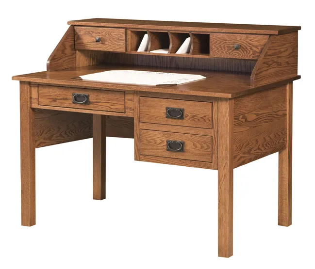 If you’d like a comprehensive desk for a small space, this option is perfect. The desk has three drawers and an additional hutch for extra space. The hutch has two more drawers and compartments to organize your mail and bills.