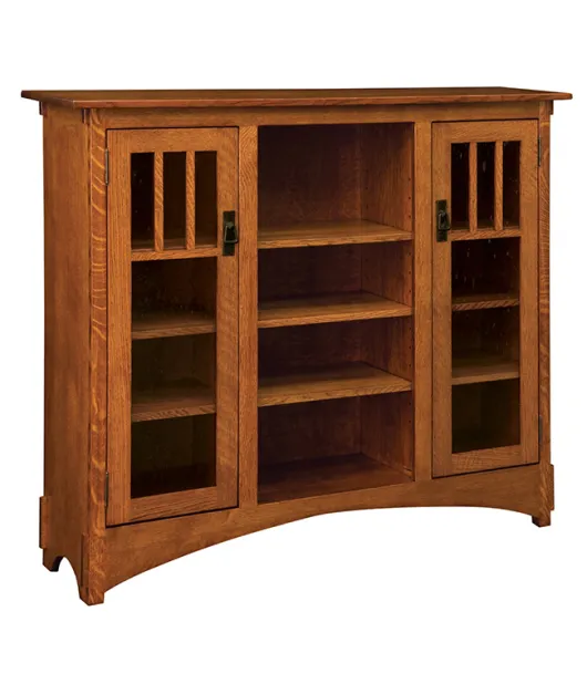 This bookcase combines style and purpose with ample wooden shelving and fashionable glass doors. The two glass doors open outward for easy access to your belongings. The center column of shelves is a space to showcase collectables. Dimensions: 56"w x 14½"d x 48"h Standard Features: Mission Display Bookcase with Open Display Seedy glass 9 adjustable shelves in Each Compartment