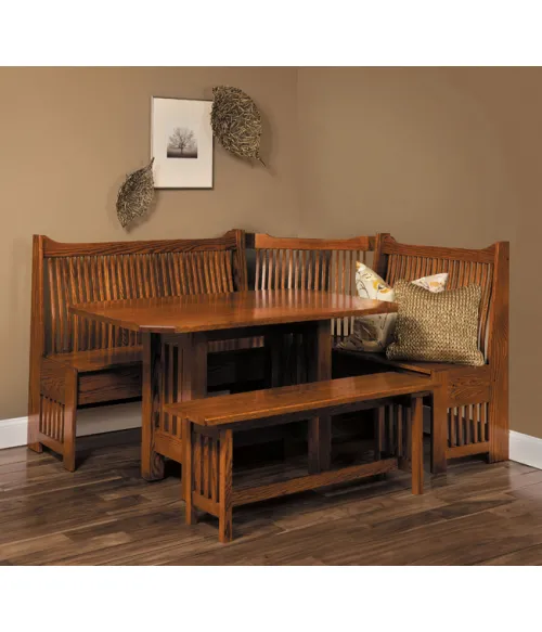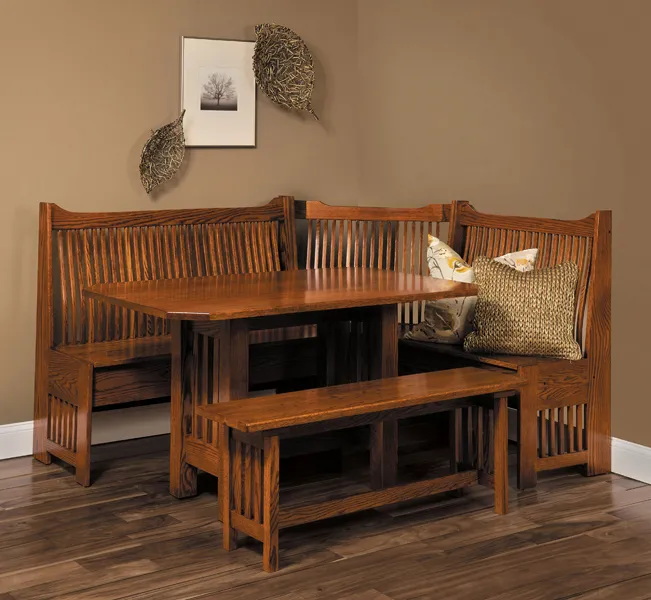 Truly stunning, this nook set is perfect for creating a focal point in your home. This set includes two benches and a corner piece, a table and an extra backless bench for more seating. The table can accommodate up to two chairs lengthwise if you’d rather have chairs instead of a bench. The nook benches even have storage in their seats to tuck away any items you’d like to keep readily on hand for meals. The corner bench has a leaf on the back so there is a shelf for storage or home décor in that hard to utilize corner space. The Mission style details in this set are welcoming and classic with a modern sensibility.