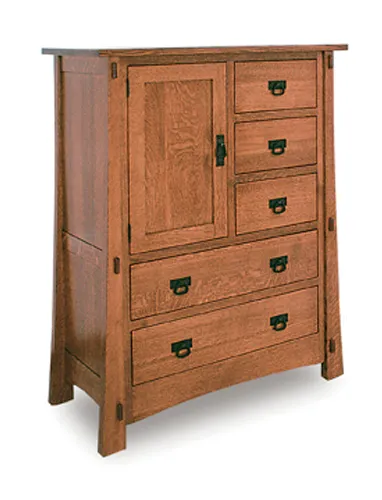 Modesto 1 Door 5 Drawer Chest has traditional mission style in a new dimension. It has flared legs and mission line with exposed tendons. This chest of drawers features good and practical 5 drawers compartments for all the things you value.