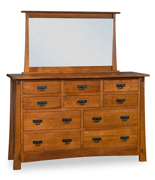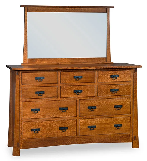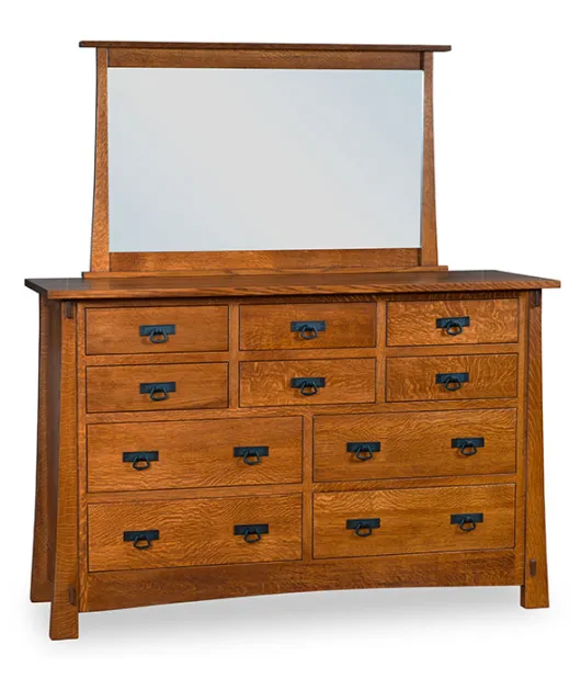 Modesto 10 Drawer Dresser is a practical and plenty of storage for your things. This piece has defined, flared legs and Mission-style lines. The exposed tendons are a added design that gives uniquenes to this dresser. The top of the it can be a place for your decorative pieces such as vase, photo frames and mirror too.