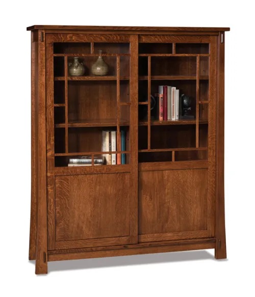 The Amish Modesto 8 Shelf, 2 Door Bookcase showcases self positioning, soft close, sliding glass. It is also available in wood doors with clear glass. One of the shelves is adjustable and can be removed if desired. With this furnishing, you get a versatile bookcase that also acts as cabinet! Perfect for a collection of valuable vases, china or rare hardbound book copies.