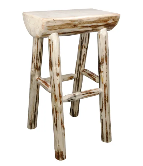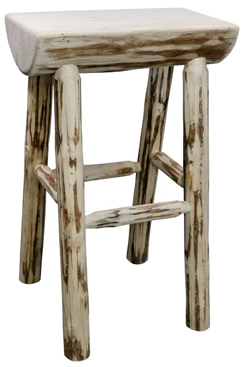 The Montana Half Log Bar Stool creates a rustic experience with sturdy twig and log legs supporting the half-log seat.