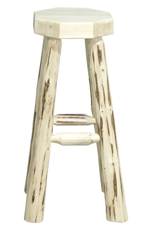 The Montana No Back Bar Stool has long log legs and an elegant geometric seat for a rustic atmoshpere.