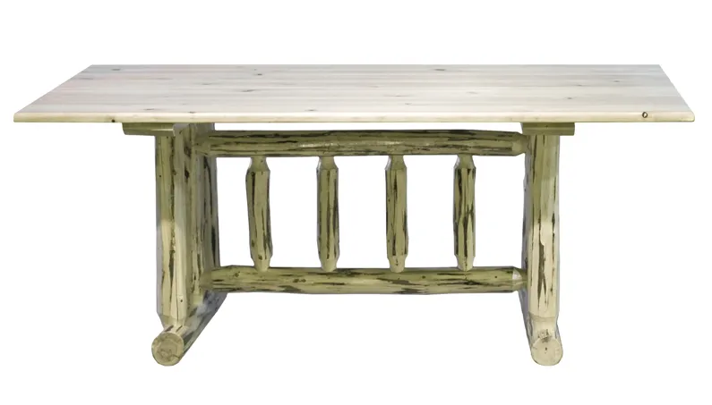 What better style to build a trestle table than the Montana! This solid wood table's trestle is built of logs. The top is varied in color by hand-selected natural wood. Despite its rustic uniqueness, this table will never go out of style.