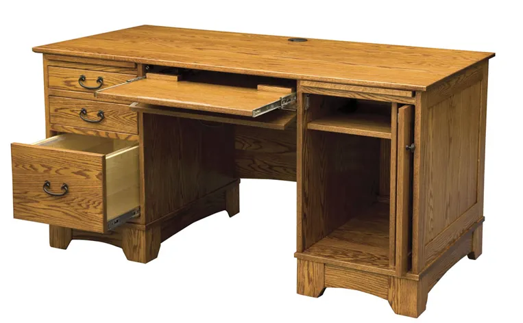 Computer desk has a CPU pocket door on the right pedestal
