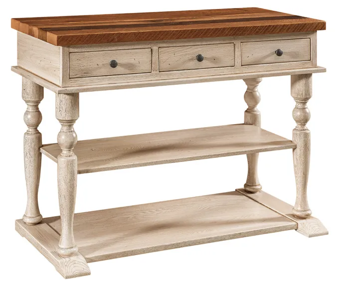 Pictured in oak with True Reclaimed Barn Wood top. Top shown in Natural finish and base shown in White Paint with Warm Brown Glaze, Distressed.