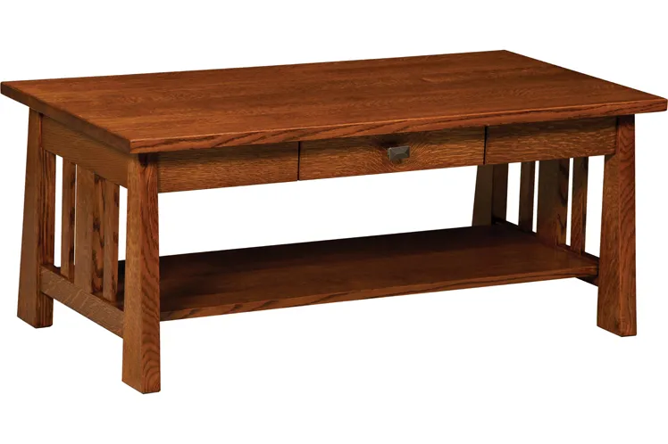 The pictured Open Freemont Mission Coffee Table is built in qs white oak with Michael Cherry stain.
