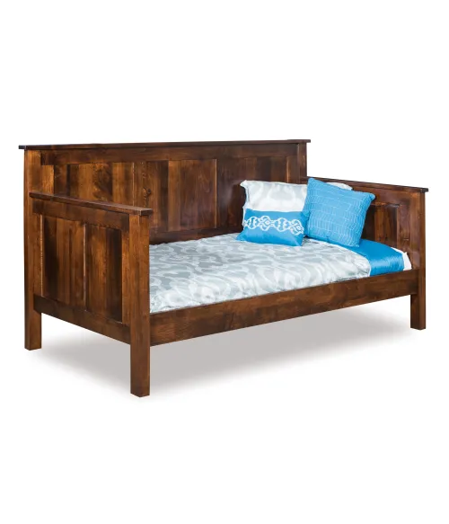 For the lover of solid wood, this bed is paneled all around the Mission-style frame. Outside the arm rests is the added texture of a plank separating the panels, but real wood grain adds interest on every side.