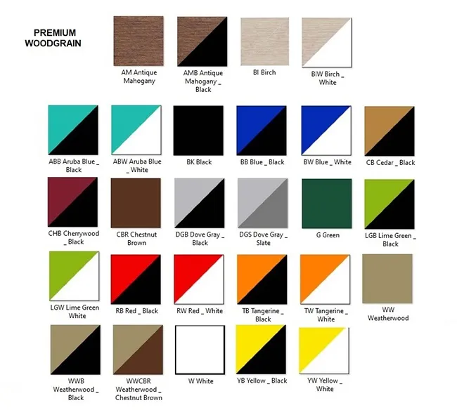 *Available in White, Black, Chestnut Brown, Weatherwood, Green, Dove Gray/Slate, Dove Gray/Black, Cedar/Black, Weatherwood/Chestnut Brown, Weatherwood/Black, Cherrywood/Black, Red/Black, Tangerine/Black, Yellow/Black, Lime Green/Black, Blue/Black, Aruba Blue/Black, Red/White, Tangerine/White, Yellow/White, Lime Green/White, Blue/White, Aruba Blue/White, Antique Mahogany and Antique Mahogany/Black.