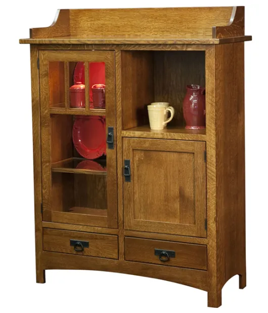 If you’d like a cabinet that doesn’t take up a lot of space in your home, the Pottery storage cabinet is ideal. This cabinet has two drawers, three compartments and a ledge to store your belongings. One of the cabinets has a glass door, glass shelves and a light inside to show off your favorite items.