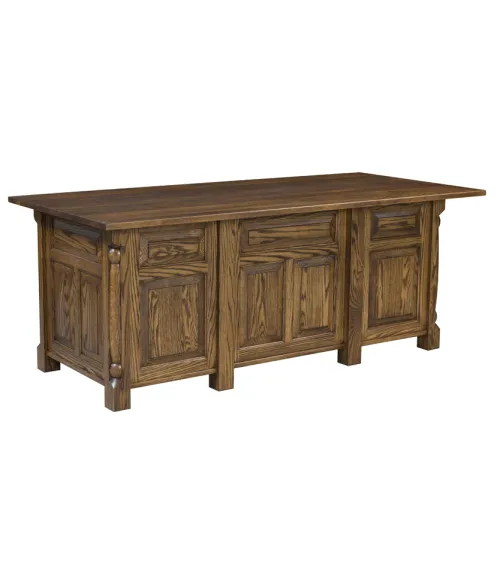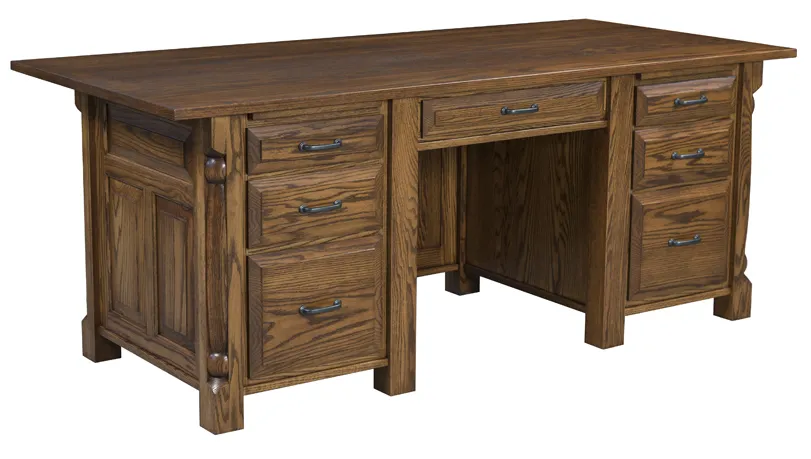 This executive desk comes with huge style. Amish-built, it has eight great square legs supporting it. The corner legs have decorative molding, while the sides and back boast classic raised panels. In front, seven raised panel drawers and the legs around the knee hole remind the viewer of luxury architecture.