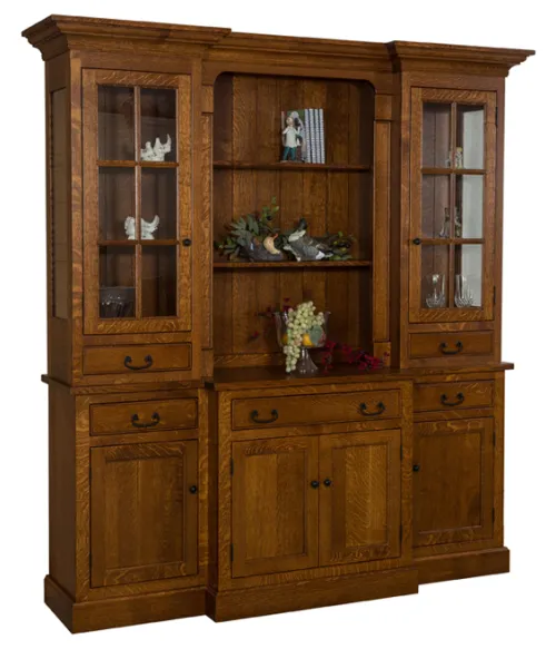 The Reagan Hutch is a luxury piece with distinguished design attributes. The most noticable uncommon features of the Reagan are the open center deck and glass side cabinets that reach all the way down to the buffet. Adding depth to the Reagan's style, the center of the buffet protrudes while the center of the hutch is recessed. Crown molding makes the recessed top look as meticulously crafted as the entire hutch surely is. The base, flat on the floor, also has elegant beak molding. Emphasizing its solid hardwood construction more than its windows and contents, the Reagan Hutch is ideal for a room that is big and bold.