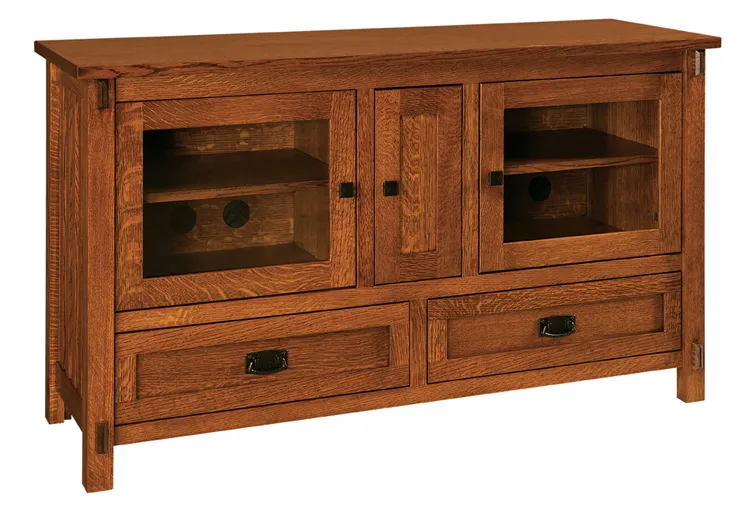 The Rio Mission TV Stand has exposed mortise joints to remind you that it is handcrafted. Recessed panels add depth to the drawers and middle door, while two glass doors reveal storage for electronics.
