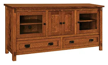 Our largest Rio Mission TV Stand comes with three compartments, the center having two aesthetic doors. Recessed panels and exposed mortise joints provide the Rio Mission with depth and character.