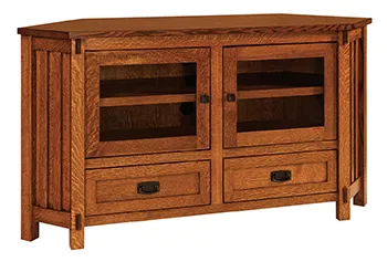 The Rio Mission Corner TV Stand for a 62'' TV has stylish exposed mortises and recess panel drawers. Black pulls accent the glass doors. The side panels have narrow vertical slats.