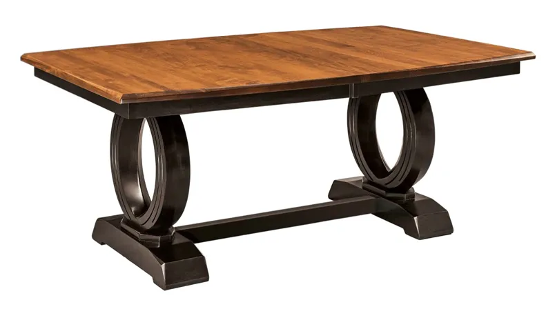 This unique table is pictured in a custom two tone finish. The Saratoga Trestle table in the picture is built in brown maple. The table top stain is FC-10749 Autumn Leaf and the base stain is FC-230 Onyx. If you would like your Saratoga trestle table to have a two tone finish, please call for the custom finish pricing.