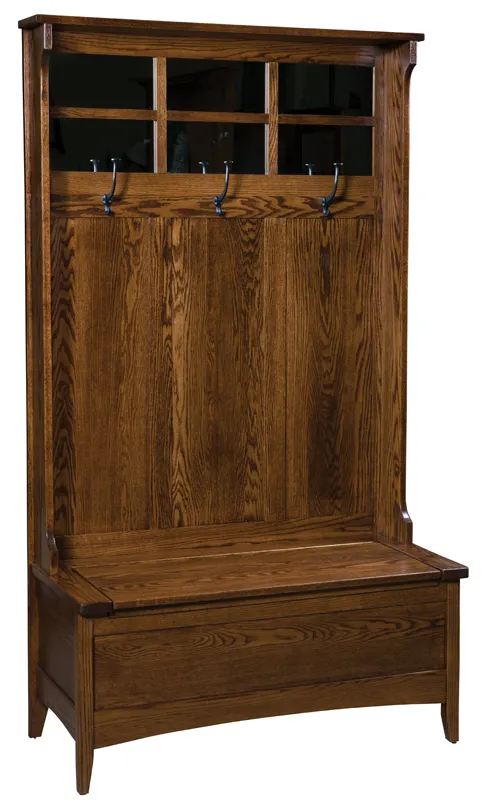 Perfect for storage in your entryway, this seat is built in the beautiful Shaker style. This piece sits ideally in a walk-in or entryway and adds tasteful storage. The back panel has three coat hooks and mirrors. The seat lifts up to reveal a storage compartment, ideal for umbrellas, ponchos or bug spray.