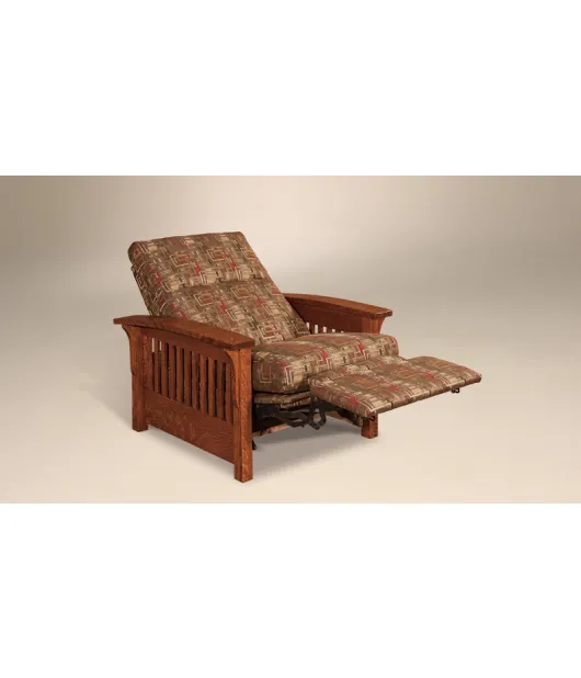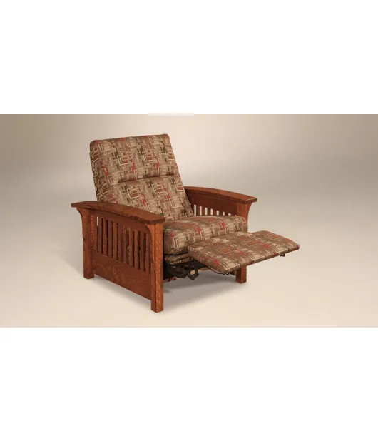 The Skyline Slat Chair Recliner has straight Mission legs and slatted sides revealing its solid wood construction. The arm rests are curved for comfort, and corbels support them from beneath for added heirloom longevity.