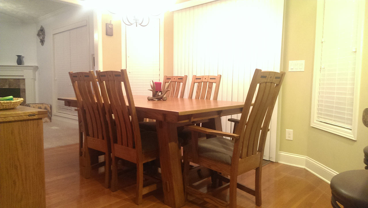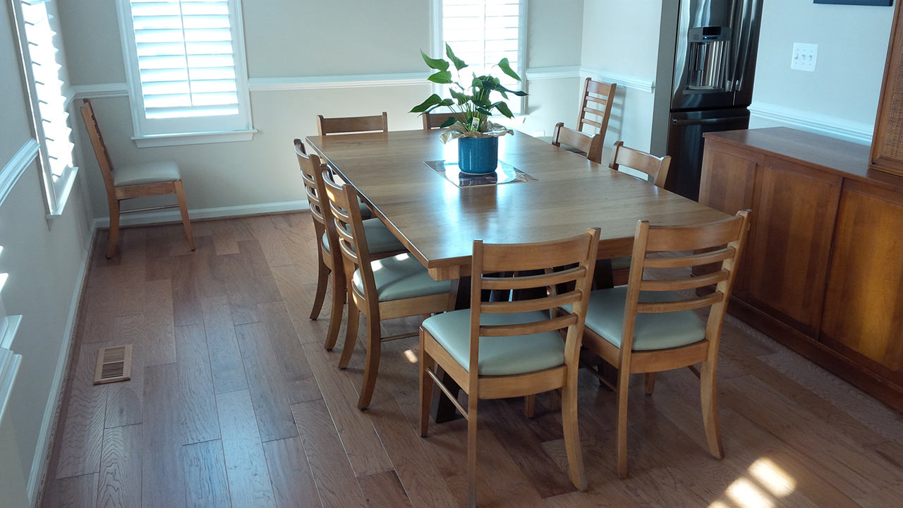 Steve Petullo of Bristow, Virginia ordered a Markley Mission Dining Table in hickory and many leather-upholstered Brady Dining Chairs in maple. The set is elegant with subdued angles for Steve's classic modern home. Steve is happy with the set: