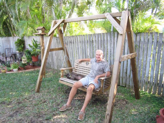 Pets always have great taste in furniture, even garden swings. Just look how much our Florida customer Rick Whitall's dog is enjoying their new four-foot Cutout Heart Pinewood Swing on its Wood A-Frame.