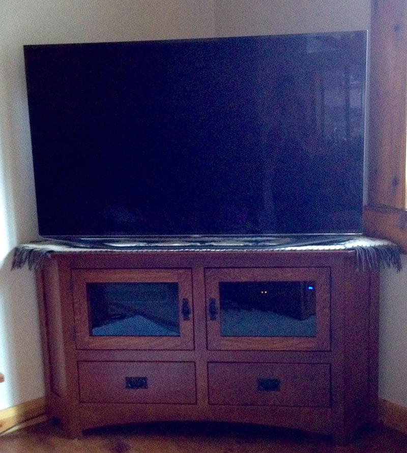 Kim's TV stand is quarter-sawn white oak with our Michael's Cherry finish. The stand's Mission-style lines and smoked glass doors are a modern complement to a flat-screen TV and the fringed mat lain softly over the stand.