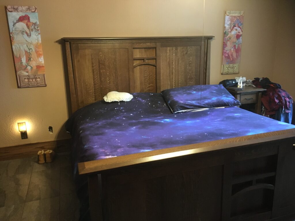 Judd from Iowa ordered Artesa King Bed built in quarter sawn white oak with FC-7136 Tanbark stain to match his other bedroom furniture. Hesitant to have it finished by us but decided to trust us with it and we are glad he was pleased with his bed.