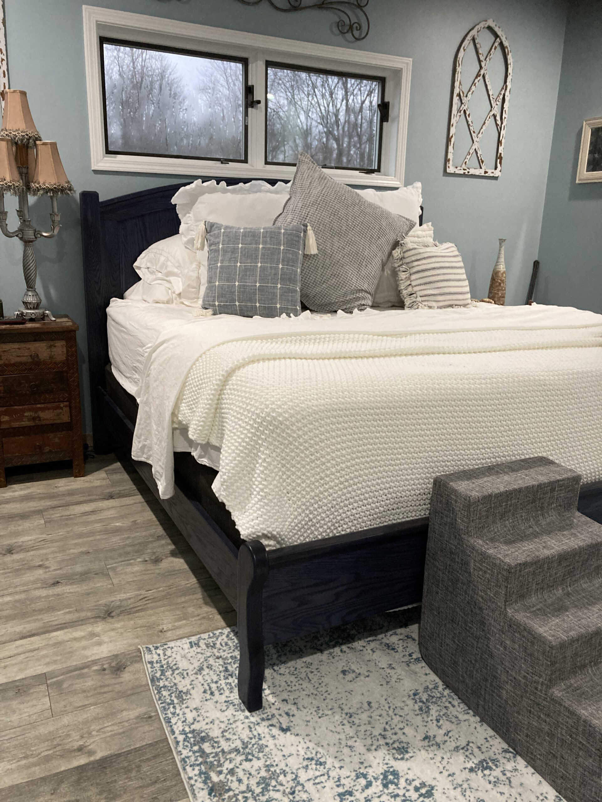 Hello! Thank you for the wonderful service in delivering my bed! The two gentlemen that arrived to set it up for me, were extremely kind, respectful, and courteous! The bed I ordered is a stunning peace and I couldn’t be happier! I chose the oak wood with an indigo finish and a low sleigh footboard. It is as solid as it is beautiful. It was tough to choose with so many customizable options! I highly recommend ordering from this company! Thanks again!