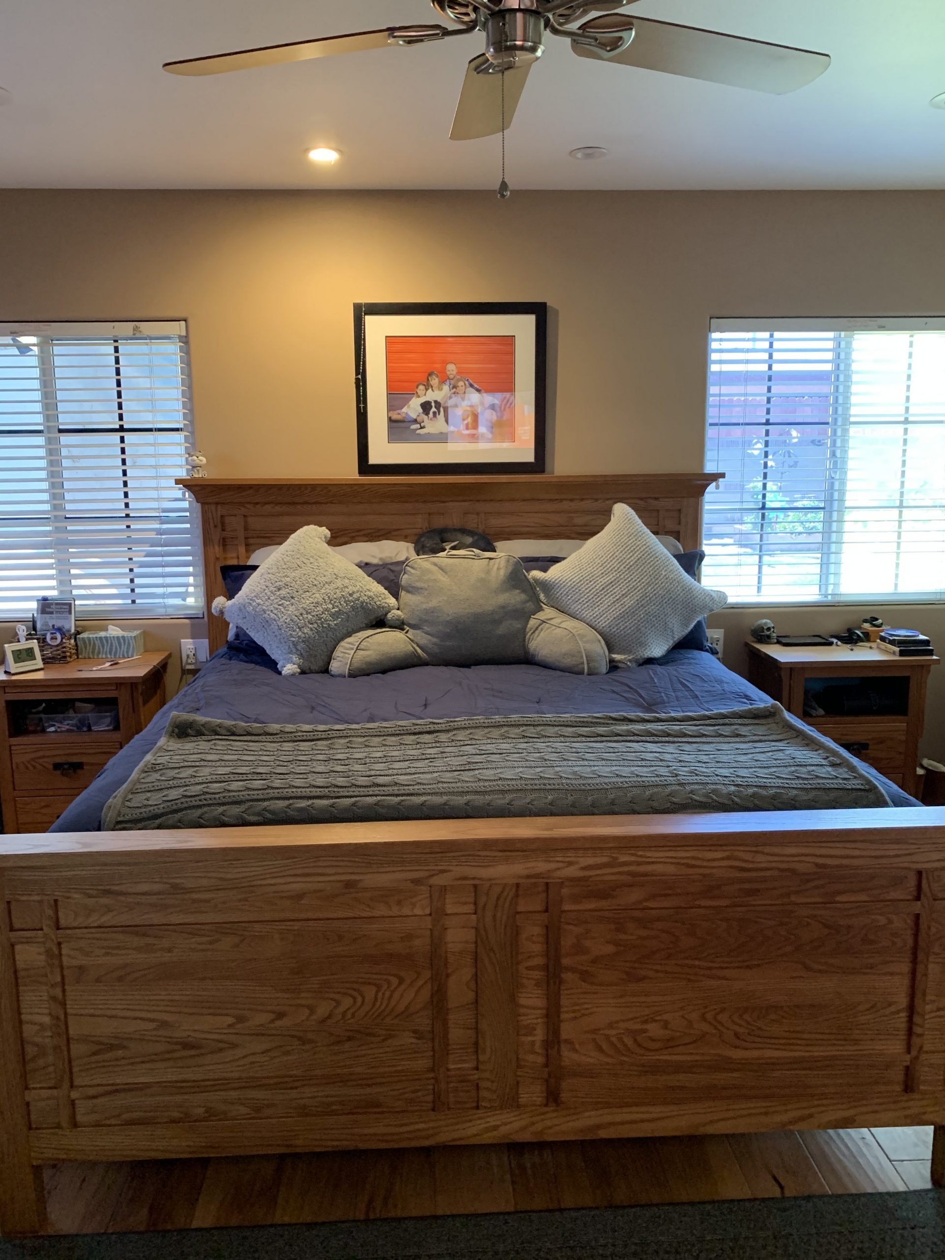 Janine and Douglas are a lovely couple who meticulously searched for bedroom furnishings at Amish Furniture Factory. Their handmade solid oak wood furniture were from Kingston Prairie selection and includes golden honey stained bed, drawer chest, dresser, nightstand, a double bookcase as well as the beveled wall mirror that will complete an organic feel yet "instagramm-able" look.