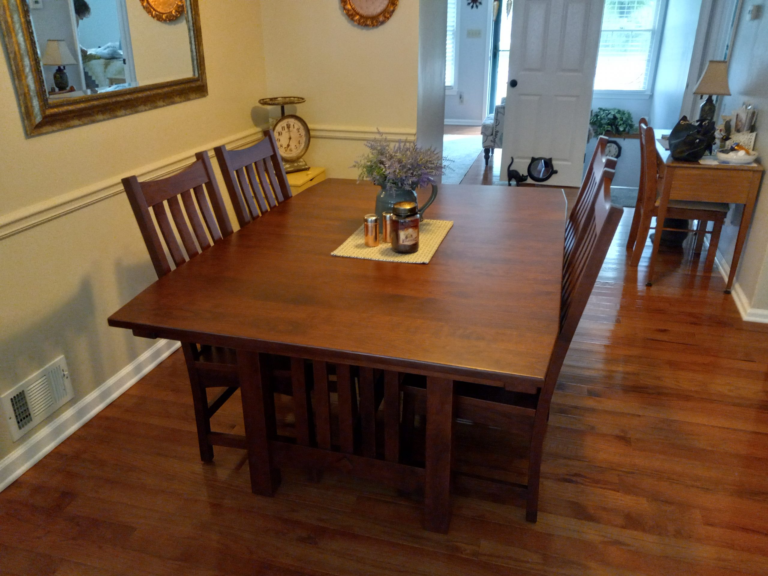 Kathy simply fell in love with the beautiful Bellingham dining chairs and trestle dining table that were delivered directly into her dining room from Amish Factory. These solid wood, heirloom treasures are made from rustic cherry wood in Baywood finish that will be adored by generations.