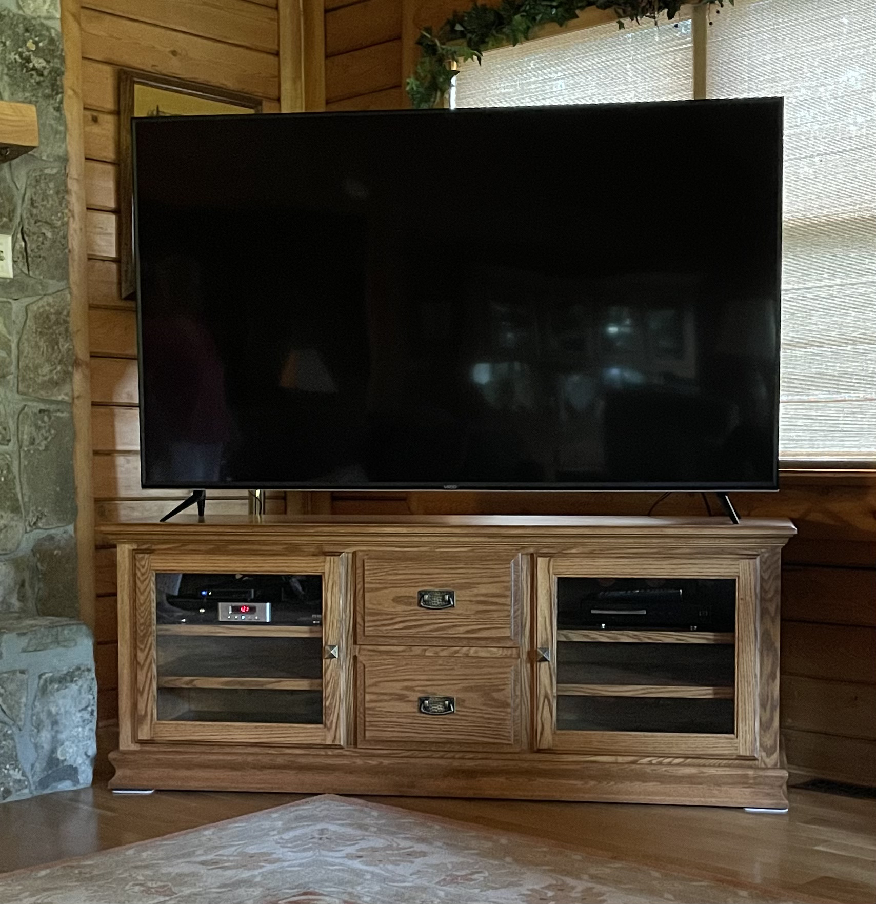She was looking for a TV stand and quickly ordered an oak finish, Sealy stained piece from the well-loved Heritage line. The door glass, slides, and even the knobs were customized to exceed her expectations