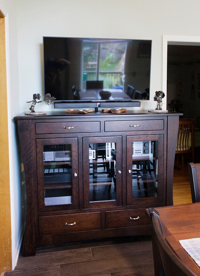 “I was in the process of remodeling my kitchen and had found the perfect two-tone tall table and chairs and needed a stereo/media cabinet to match. I found a beautiful tall buffet on the Amish Furniture Factory website that was the perfect width but there were two things that I wished were different. The darker stain color I needed was not listed as available and I needed two wooden shelves instead of one glass shelf.
