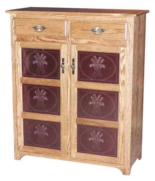 If you have a busy kitchen, don't slow down to figure out where to store your creations. The solid oak pie safe has two doors with 3 copper plates each that swing open to reveal extra kitchen storage. The rustic design complements any homey kitchen. This cupboard has additional drawers on top for even more storage.