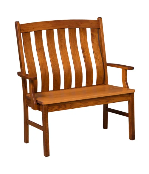 An arched head rest and seven broad back slats add optimism to this Mission-style bench, while contouring adds comfort. The classic dining area, hallway or even living room will welcome all with the help of this dependable bench.