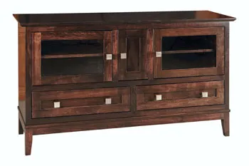The Venice SC-60 TV Stand is wide enough to complement a large TV and store media in the center. Paneled drawers and glass doors with square knobs give this heirloom geometric style. This TV stand has tapered feet.
