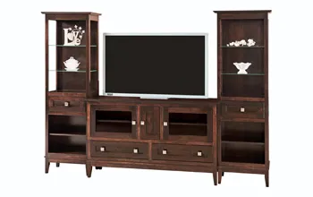 The Venice TV Stand with Towers has elegant Shaker style with squared angles and tapered feet. The towers have open shelving to display any media or decor—your choice. A single drawer in each tower balances their vertical aesthetic. The Venice line's style has paneled drawers and glass doors with square knobs for a pointedly classic design. The three pieces boast heirloom hardwood construction and can be reconfigured to create the function and style of the next generation.