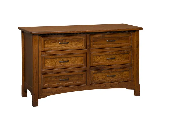 The West Lake 6 Drawer Dresser is a solid hardwood dresser. The legs are incised near the feet and beveled all the way up the corners. An arch near the bottom adds support and shaping. The six drawers are mitered so that each one stands out in style. Just beneath the dresser top is rope molding to draw the eye up the dresser. This Mission style dresser suits an elegant decor scheme, adding just enough handcrafted detailing to keep your space lively.
