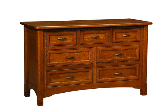 The West Lake Seven Drawer Dresser is the largest dresser available in this classically styled and impeccably built. Made of solid oak, this dresser is built to last. The Amish construction is unmistakable—this dresser is made of solid wood with an attention to detail that cannot be beat. Each of the seven drawers has dovetailed joints and full-extension slides for easy access to all contents within the drawer.