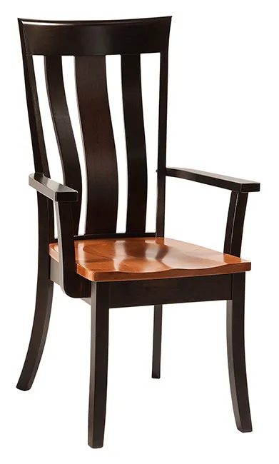 Pictured in Brown Maple with seat in FC-12108 S-14 Stain and frame in FC-230 Onyx Stain in a custom two tone finish. On video: seat and back slats in wormy maple, frame in walnut, with clear coat finish. Custom finishes need to be ordered by phone.
