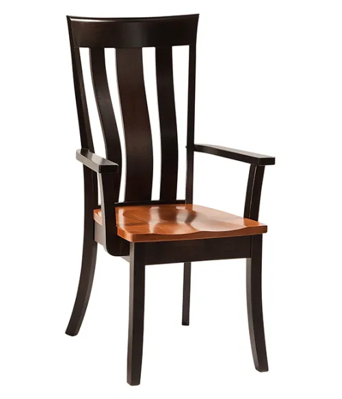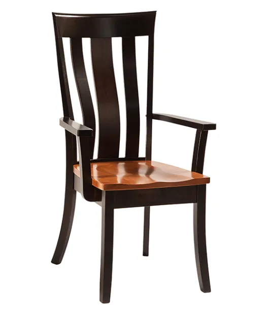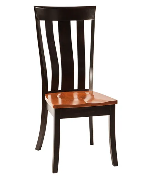 Pictured in Brown Maple with seat in FC-12108 S-14 Stain and frame in FC-230 Onyx Stain in a custom two tone finish. On video: seat and back slats in wormy maple, frame in walnut, with clear coat finish. Custom finishes need to be ordered by phone.